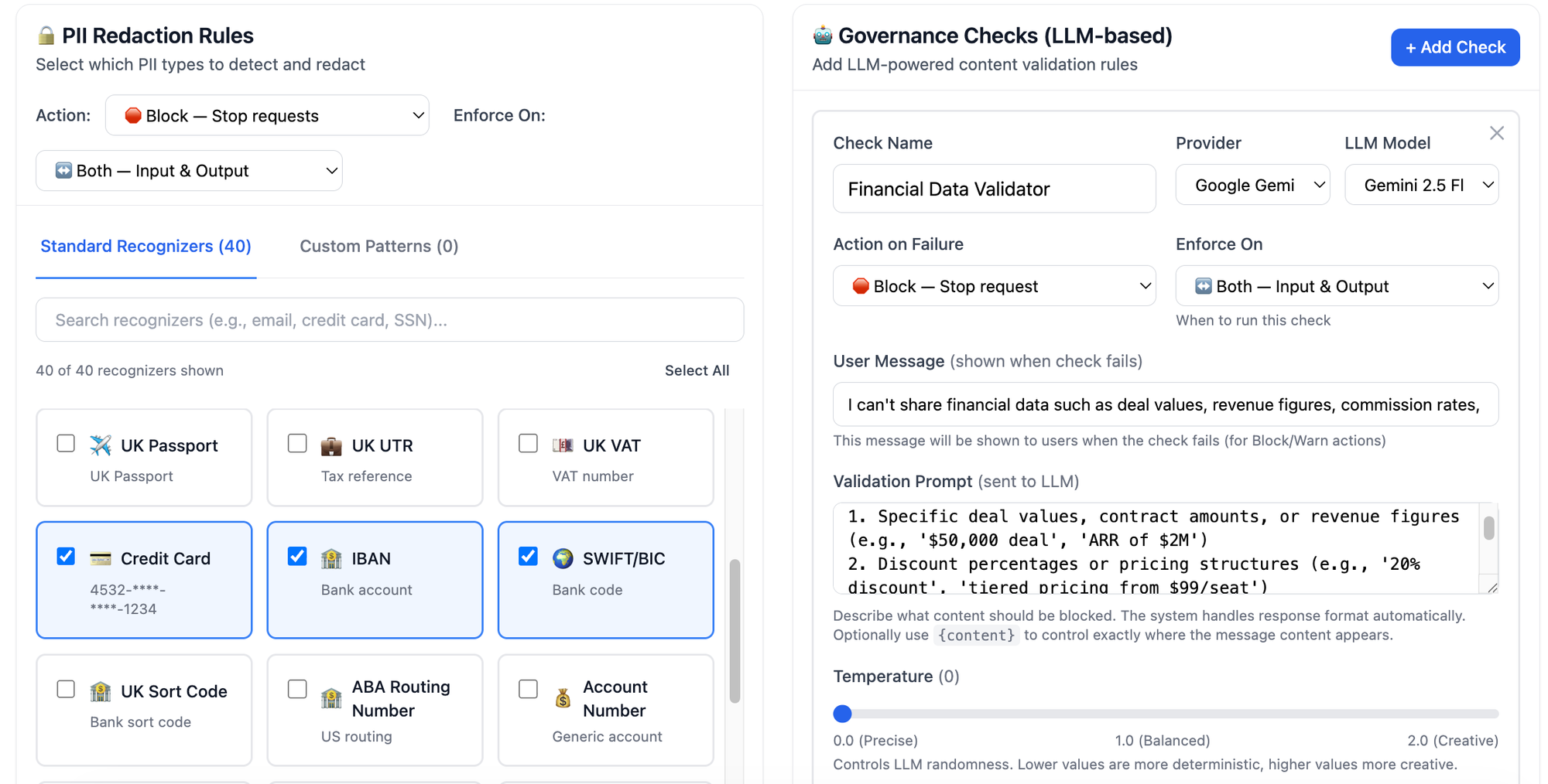 What you actually need is an AI endpoint that is intelligent enough to understand what financial data looks like in context, and governed enough to automatically redact or block it before it reaches the model or the user — without breaking the assistant's usefulness for everything else.